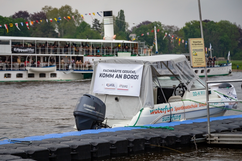 Dabei waren die Firma impaq und wir MITTENDRIN. Wir nutzen das große Spektakel auf der Elbe für ein besonderes Manöver. "Fachkräfte gesucht - Komm an Bord" war das Motto unserer Bootstour, denn wir hielten Ausschau nach neuen Crew-Mitgliedern. Wer noch anheuern möchte, kann sich gern bei Herrn Müller von impaq melden oder sich auf unserer Karriere-Seite nach passenden Stellen umsehen. Wir freuen uns auf künftige Unterstützung - apropos Unterstützung ... wir danken auch der Sportbootschule Dresden für den Verleih des Bootes für unsere Tour.